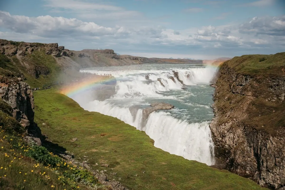 Der Fluss Hvítá stürzt zunächst 11 Meter über einen ersten Fall, macht dann eine 90-Grad-Wendung, bevor er weitere 21 Meter in eine enge Schlucht stürzt. Das milchig-weiße Gletscherwasser (woher der Name "weißer Fluss") schafft ein hypnotisierendes Schauspiel.