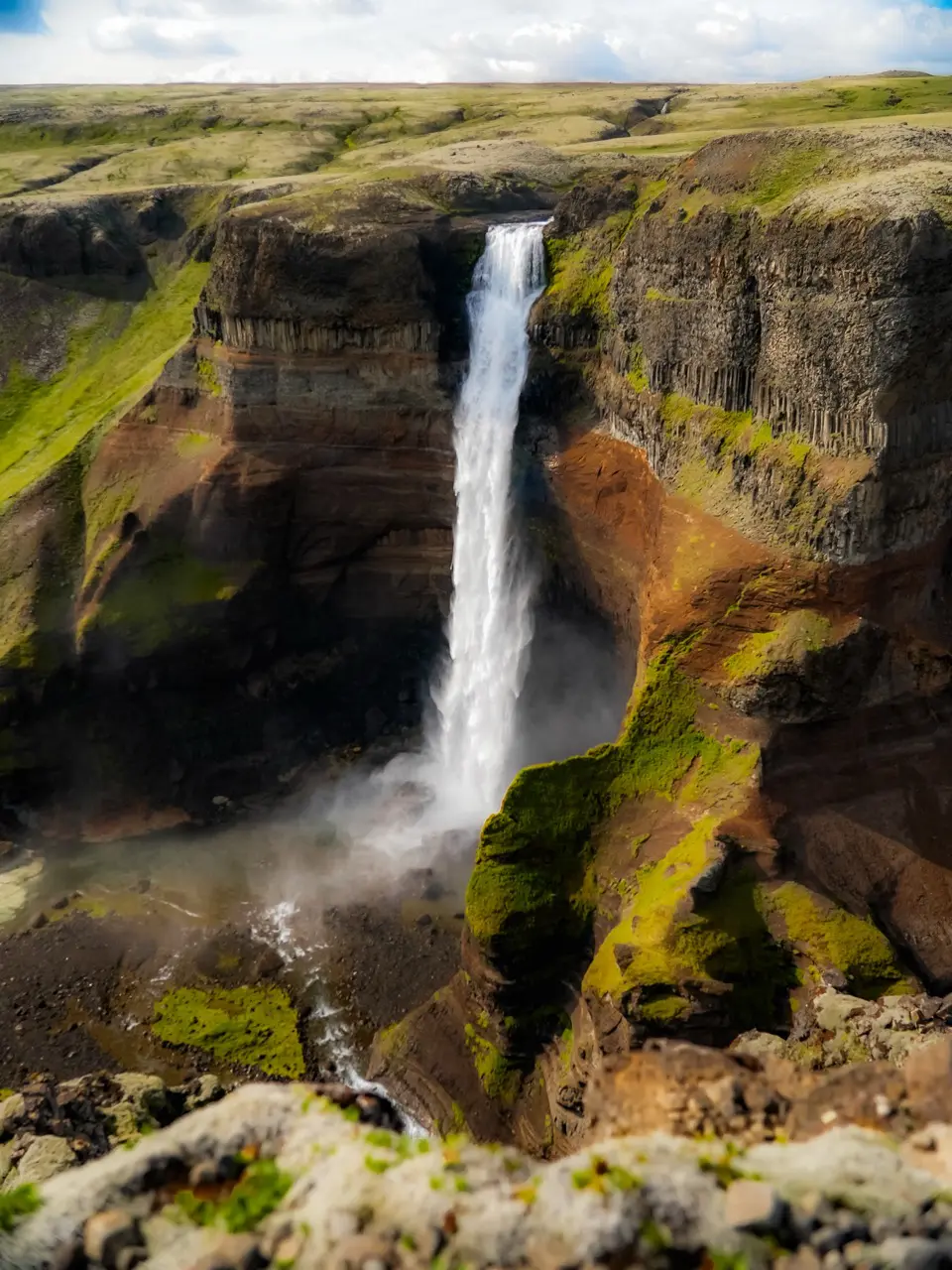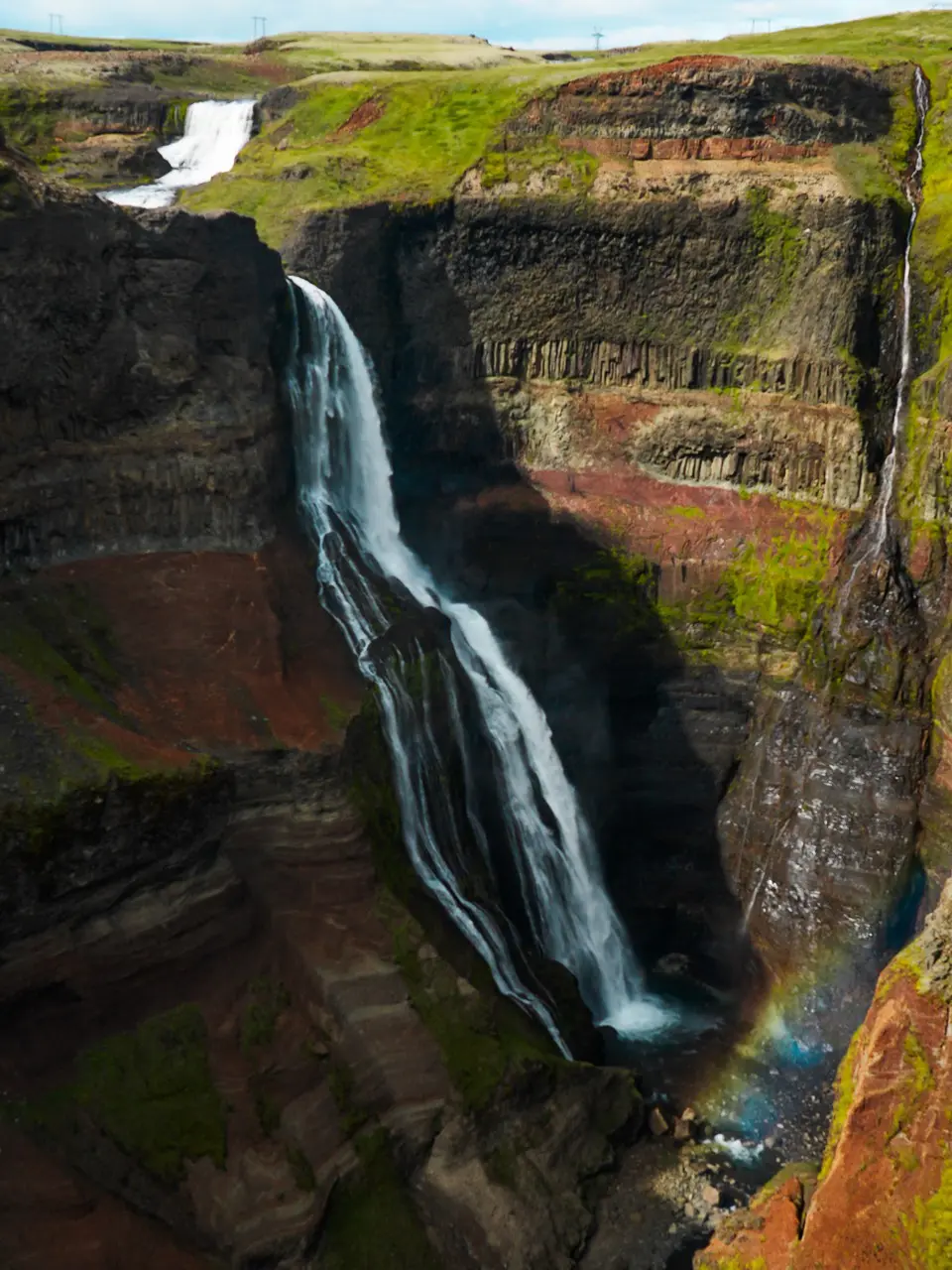 Was den Haifoss spektakulär macht, ist nicht nur seine Höhe, sondern auch die Umgebung: zwei Zwillingswasserfälle (Haifoss und Granni gleich daneben), die in eine tiefe Schlucht stürzen, umgeben von bunten Bergen. Der Ausblick vom Aussichtspunkt ist atemberaubend.